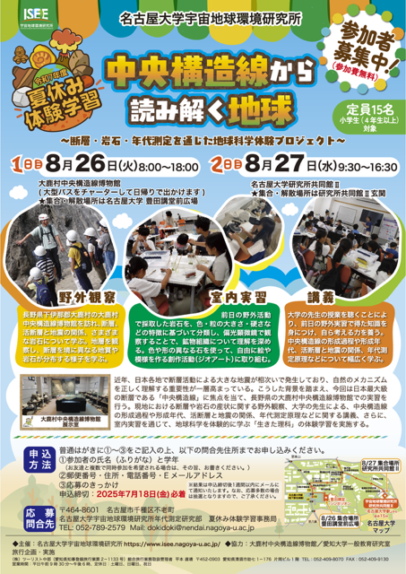 宇宙地球環境研究所では、小学生(4年生以上)を対象とした令和7年度 夏休み体験学習「中央構造線から読み解く地球 〜断層・岩石・年代測定を通じた地球科学〜」を実施しました。本体験学習では、断層、岩石に加えて、山崩れや砂防についても学びました。本体験学習は、詳しくはこちら